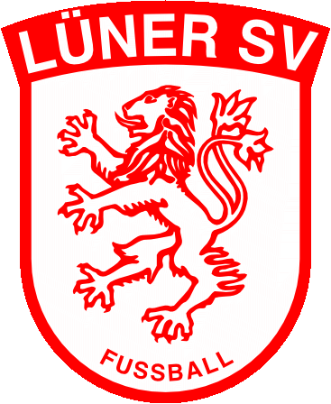 Schriftzug Weiß auf Rot ‚Lüner SV‘, darunter ein nach links gewandter, aufgerichteter, roter Löwe auf weißem Grund, dem offiziellen Stadtwappen nachempfunden.